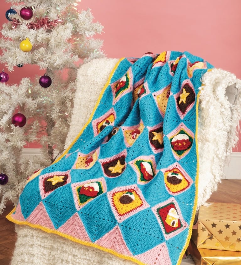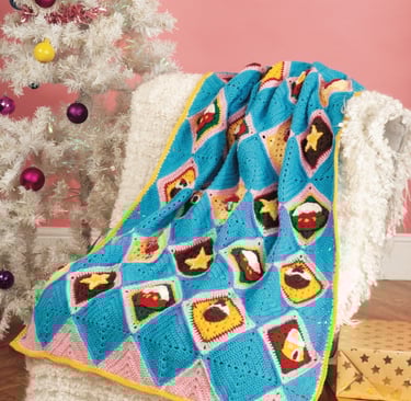 This cosy creation is bright and festive, with a retro twist—granny squares are stitched at a ninety-degree angle, forming charming diamond shapes. Each square is adorned with some of my favourite winter motifs: a candy cane, a Christmas pudding, a gingerbread house, a star cookie, and a mug of hot chocolate. The blanket combines classic granny squares, solid treble squares, and solid treble triangles, making it a joy to assemble for crafters of all levels.