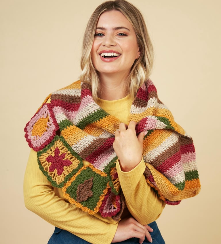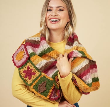 The Xarpo Wrap is perfect for layering as the weather cools,with its beautiful merino blend, it’s soft, warm, and stylish—ideal for wrapping up on crisp autumn days. The pattern is at an intermediate level, featuring a variety of stitches to create intricate leaf granny squares.